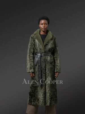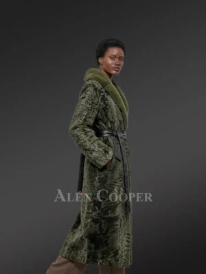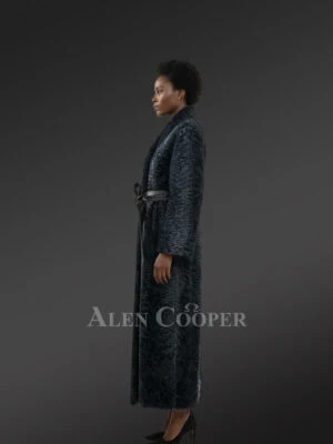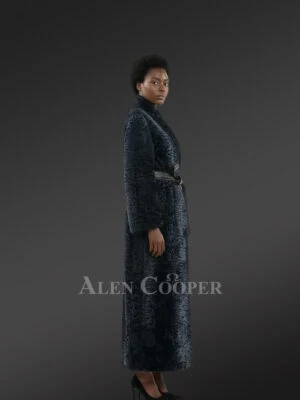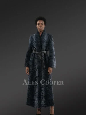 Women’s Full Length Persian Lamb Coat with Belt and Mink Collar Accent