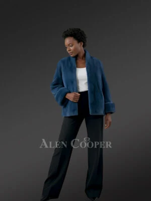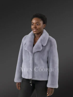 Women’s Short Dressy French Collar Mink Jacket in Blue