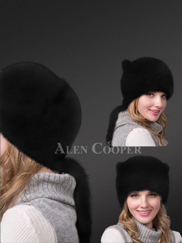 Mink Beanie Hat with Tail and Cat Ear Design for Women
