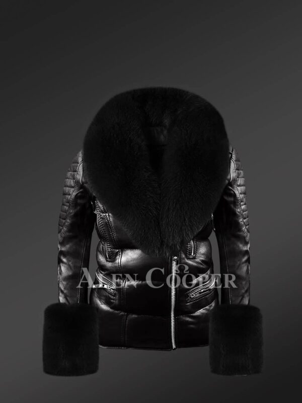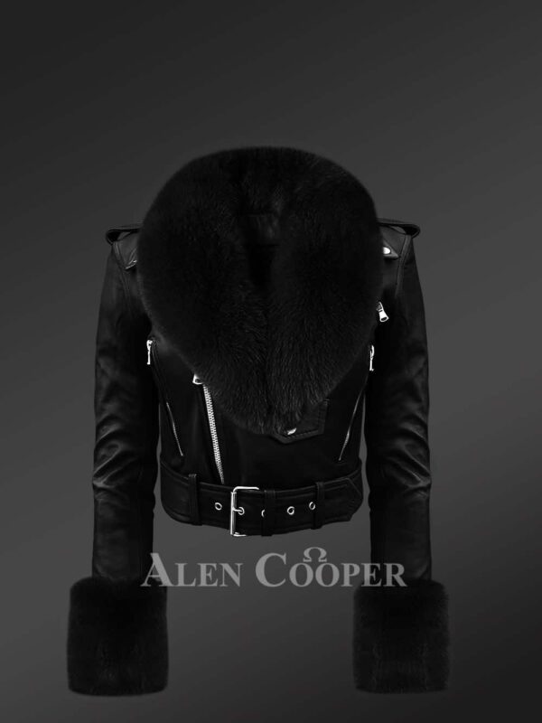Biker Leather Jacket with Fox Fur Hood and Cuffs for Women