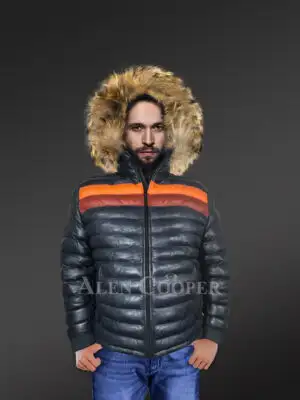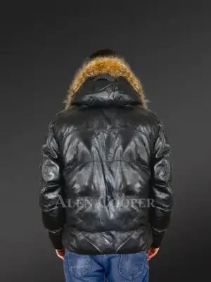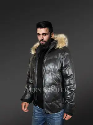 Leather Goose Down Bomber for Men with Detachable Hood