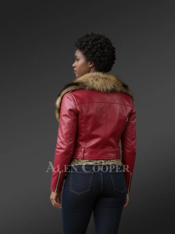 Womens Motorcycle Biker Jacket with an Elegant Raccoon Fur Collar
