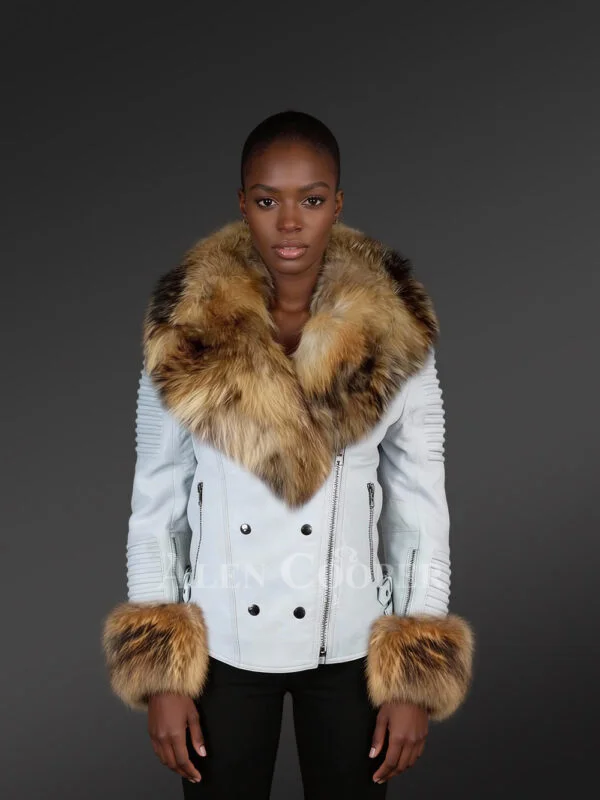 Leather Biker Jacket with Fox Fur Collar and Cuffs for Women