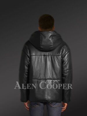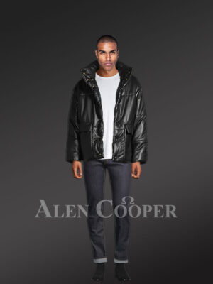 Men’s Puffer Leather Bomber Jacket with Collared Neck and Detachable Hood