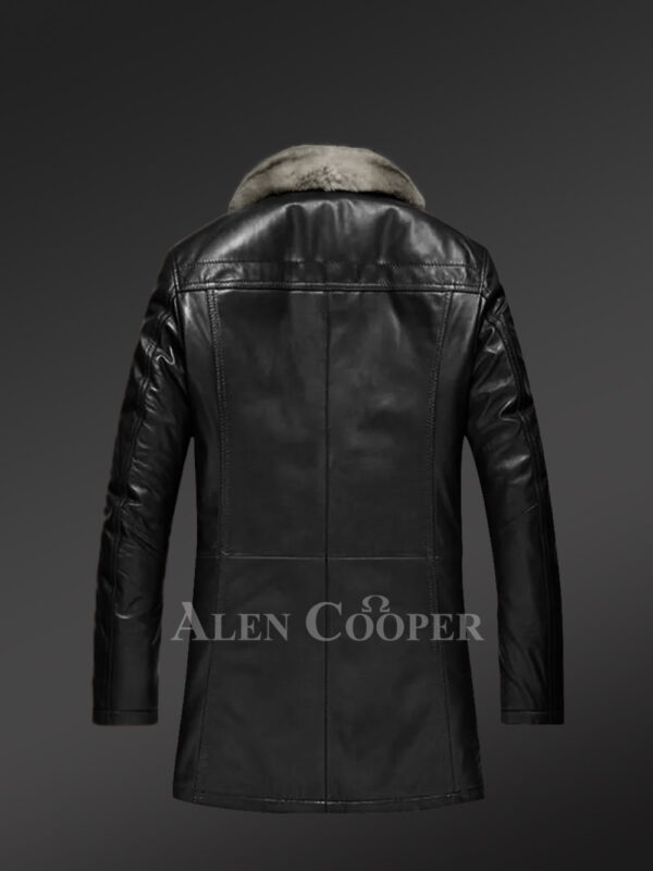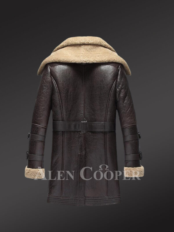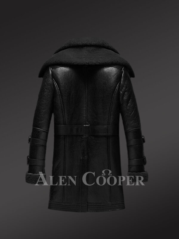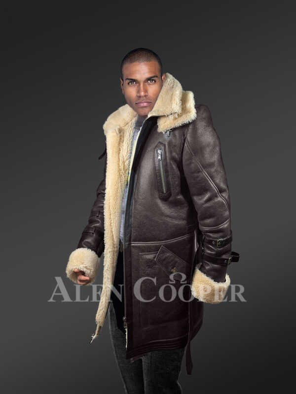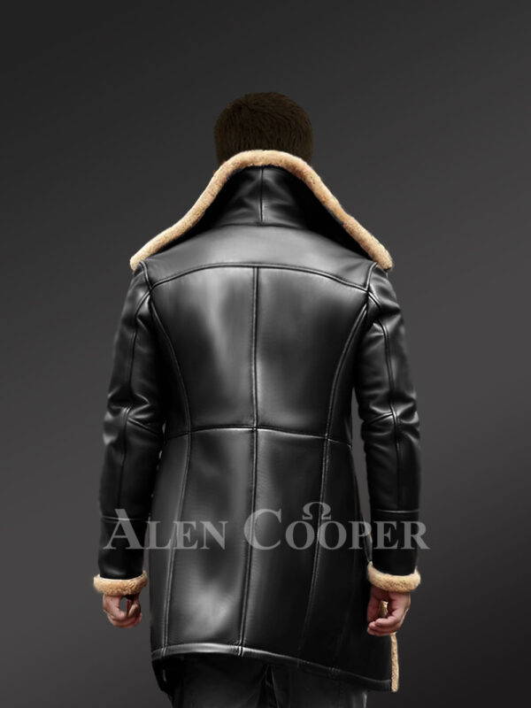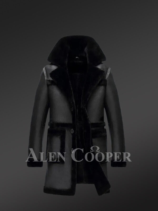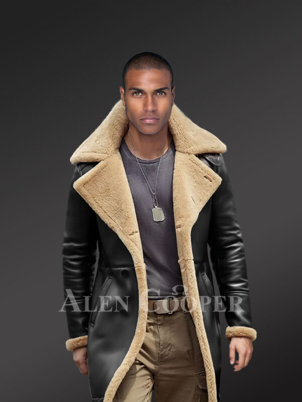 Long Sheepskin Coat for Men with Wool Trim Accents