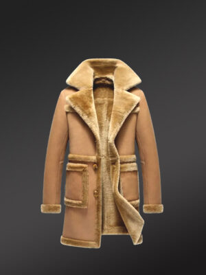 Long Sheepskin Coat for Men with Wool Trim Accents