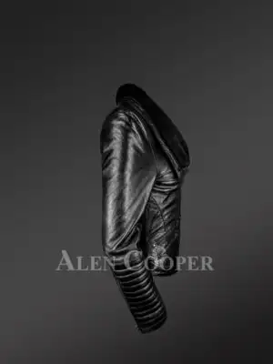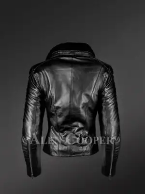Women’s Motorcycle Biker Jacket with Detachable Fox Fur Collar And Piped Sleeves in Black