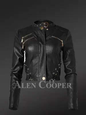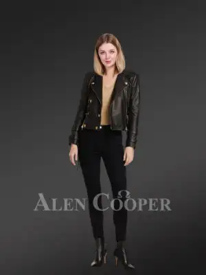 Women’s Short Length Real Leather Black Biker Jacket with Asymmetrical Zipper Closure