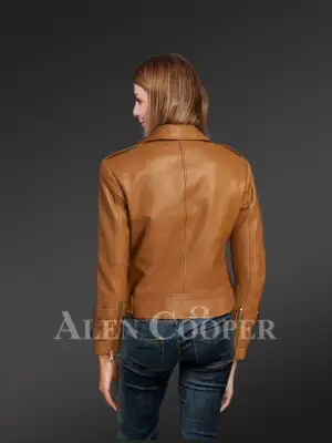 Women’s Assymetrical Motorcycle Biker Jacket in Tan with Zipout Collar