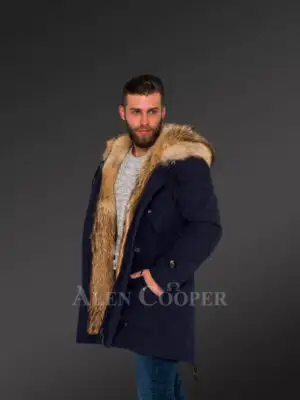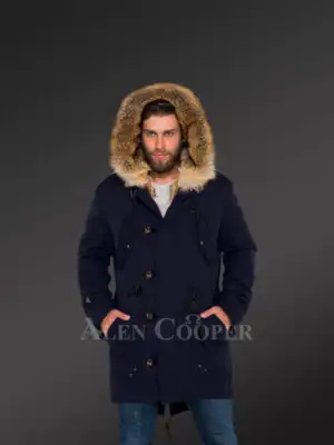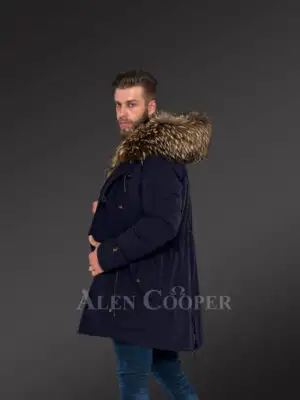 Tastefully Crafted Hybrid Finn Raccoon Fur Navy Parka for Men with Rabbit Liner