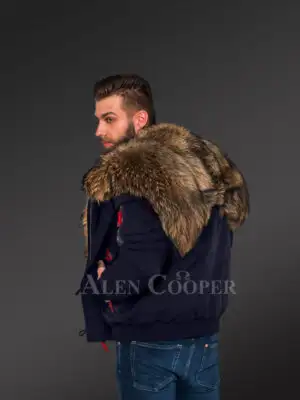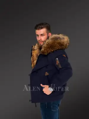 Parka Bomber in Navy with Finn Raccoon Fur Hood and Frontline for Stylish Men with Rabbit Liner
