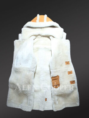 Mens Shearling Long Coat with Detachable Hood and Back Slit