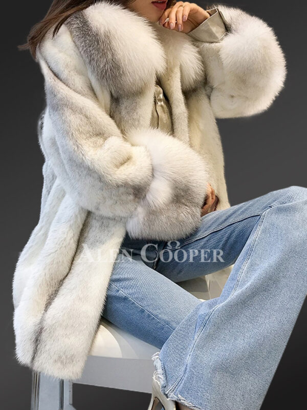 Silver-Cross Mink Fur Coat with Shadow-Blue-Frost Fox Fur Trim