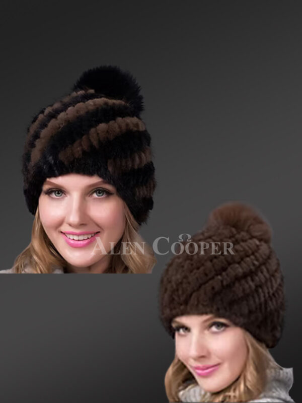 Womens Mink Hat with Fox Fur Pompom at the Top with a Playful Vibe