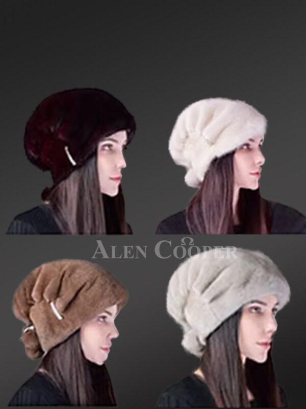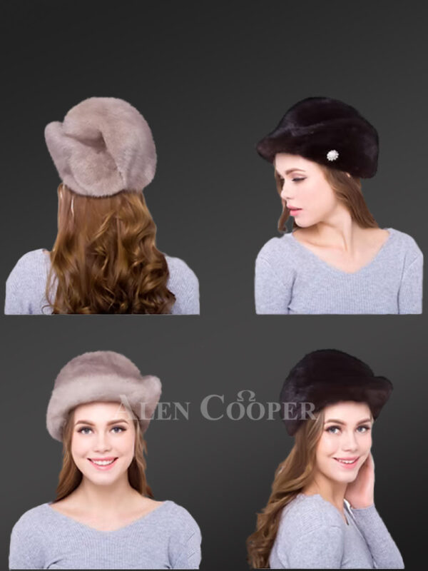 Womens Mink Hat with Pompom Adorned with Stylish Pin Detail