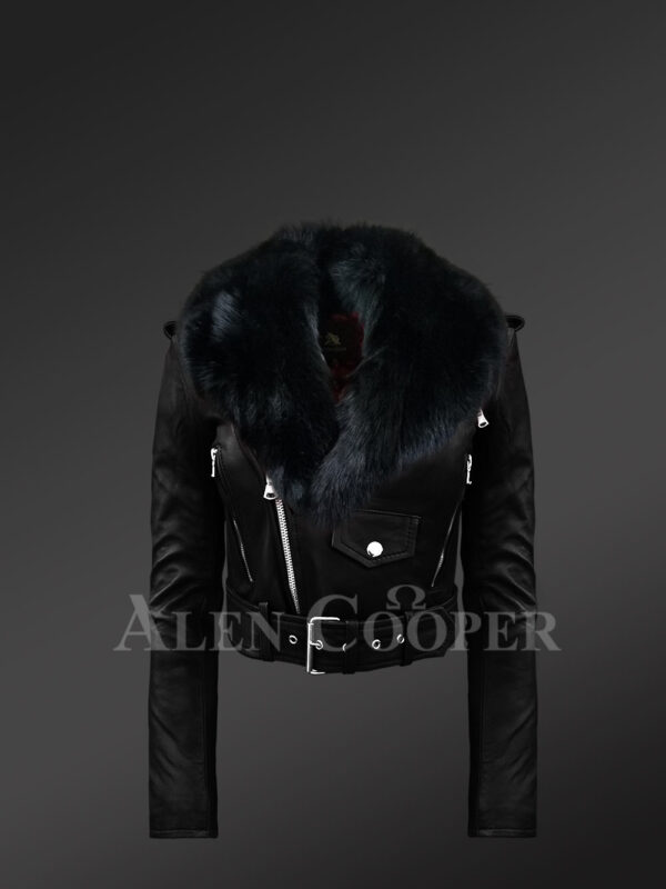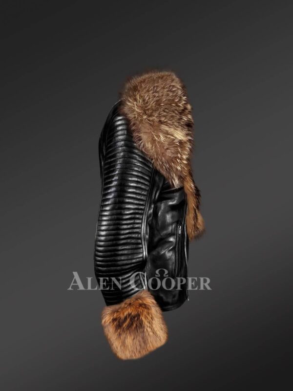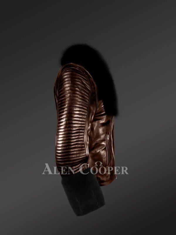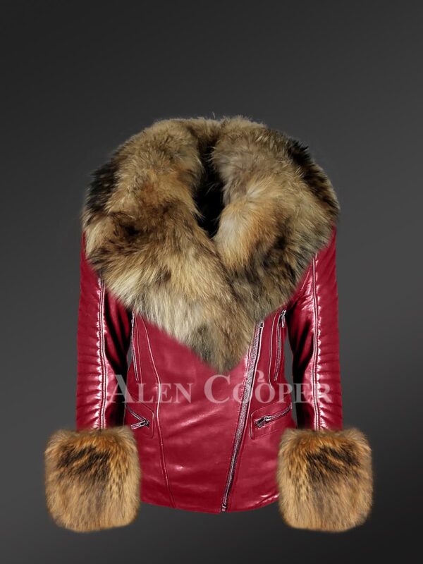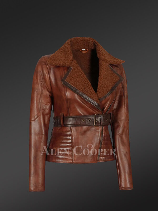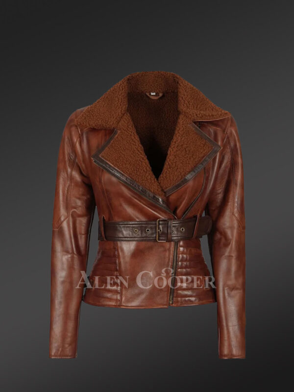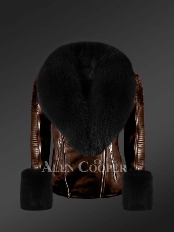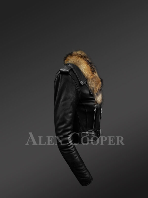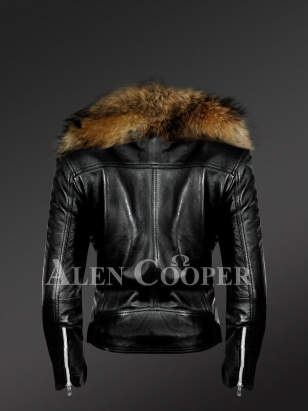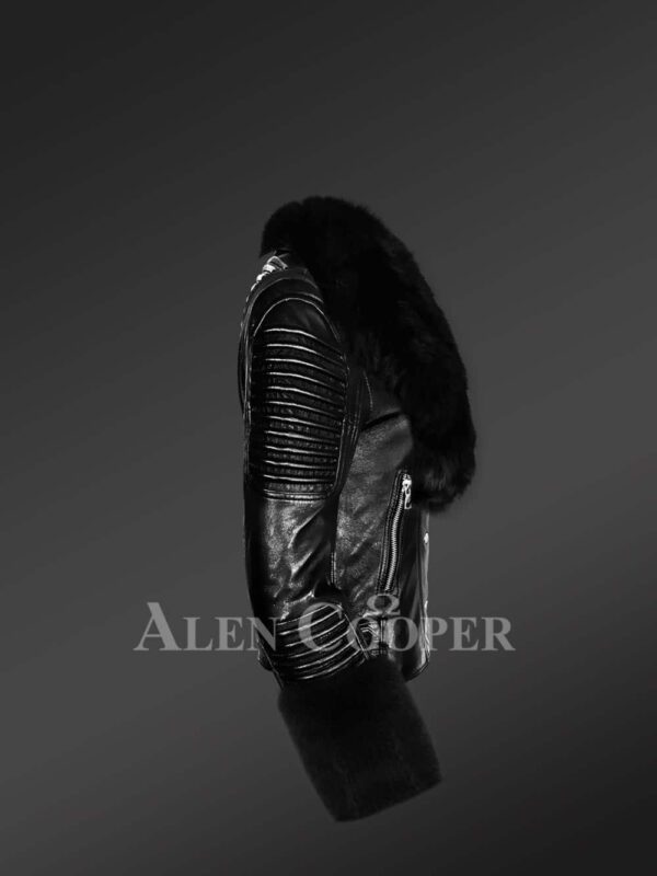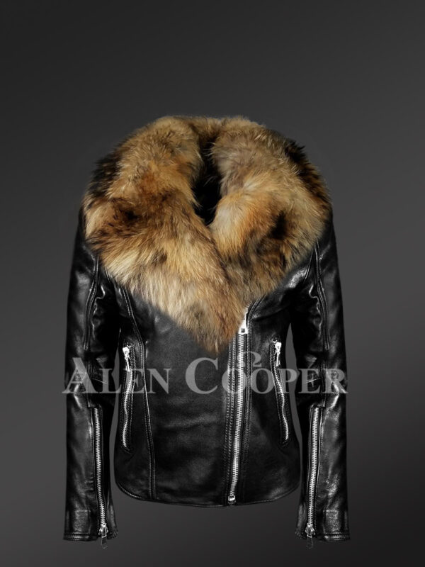 Available in a variety of sizes, this Womens leather motorcycle jacket with wool looks modern and chic. Most important is its protection ability. To point out, it carries stalwart piped feature along prone parts like cuff joints. However, the detailing adds to the beauty. The collar features soft Sheepskin wool trim. The zippered front closing is aligned diagonally. Additionally, zip-line serves as an accessorizing as well as functional trait along cuffs.
