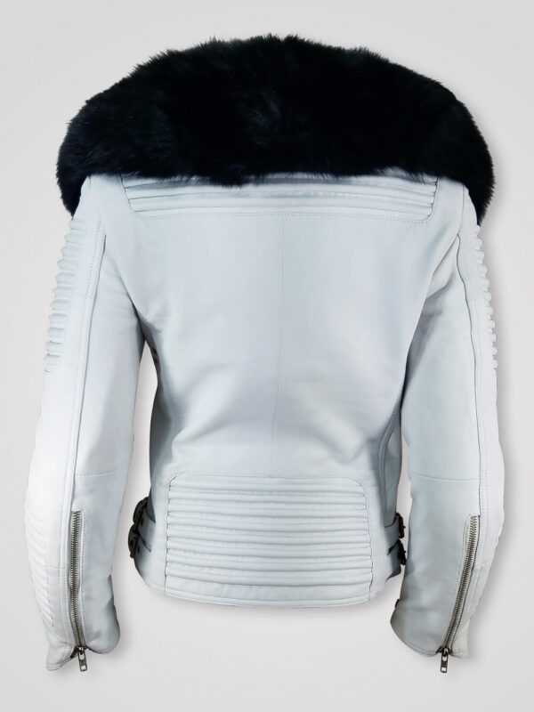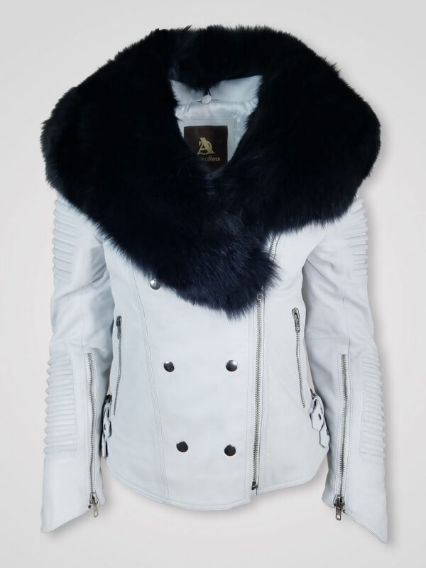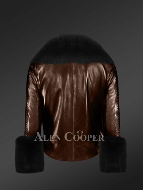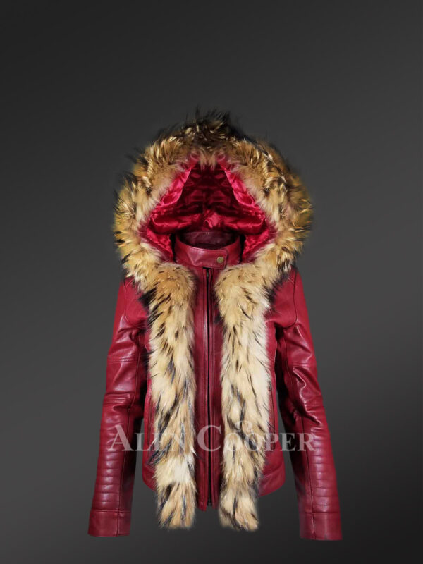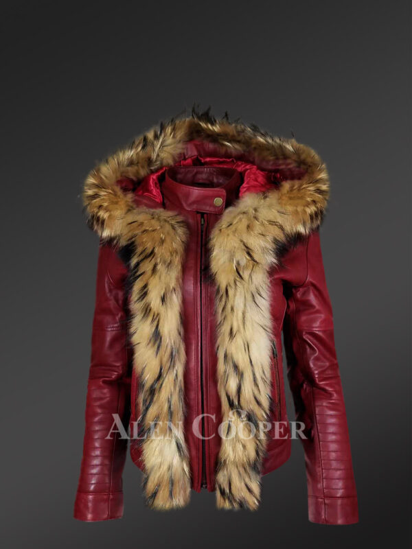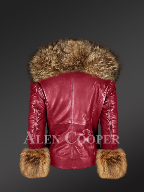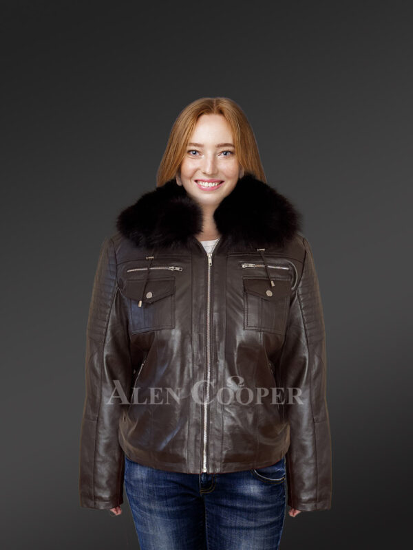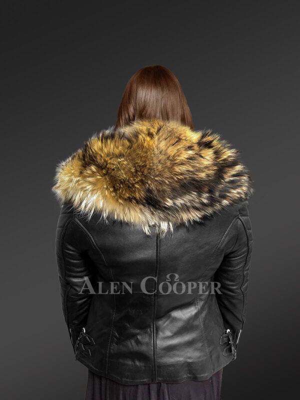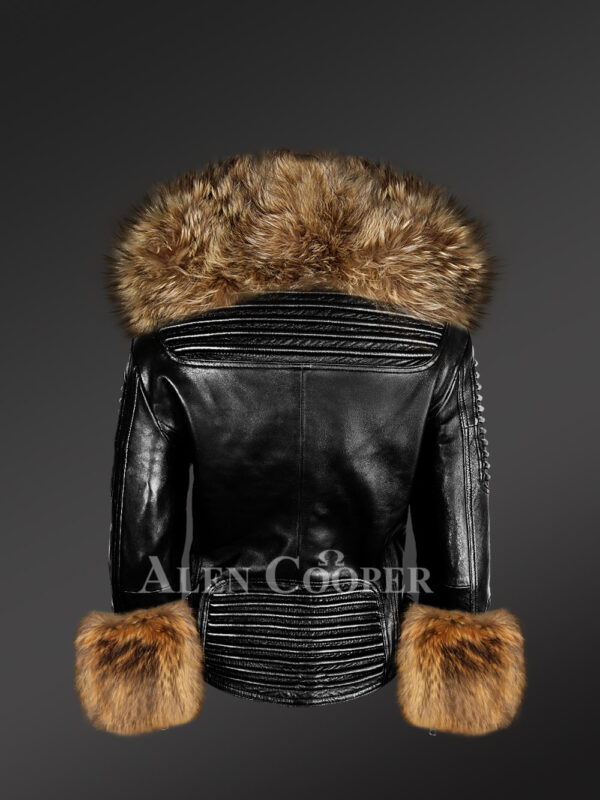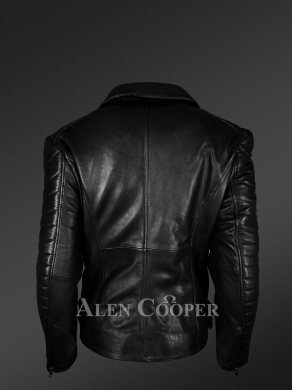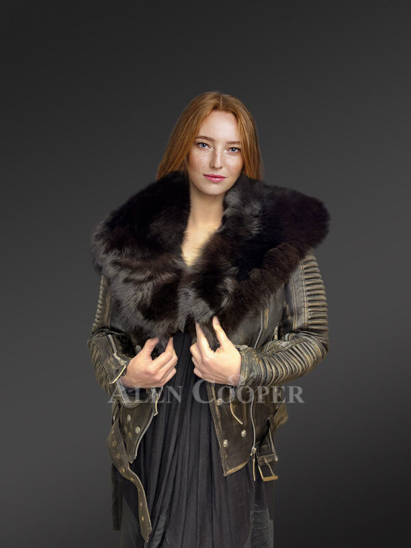 Available in a variety of sizes, this Womens leather motorcycle jacket with wool looks modern and chic. Most important is its protection ability. To point out, it carries stalwart piped feature along prone parts like cuff joints. However, the detailing adds to the beauty. The collar features soft Sheepskin wool trim. The zippered front closing is aligned diagonally. Additionally, zip-line serves as an accessorizing as well as functional trait along cuffs.