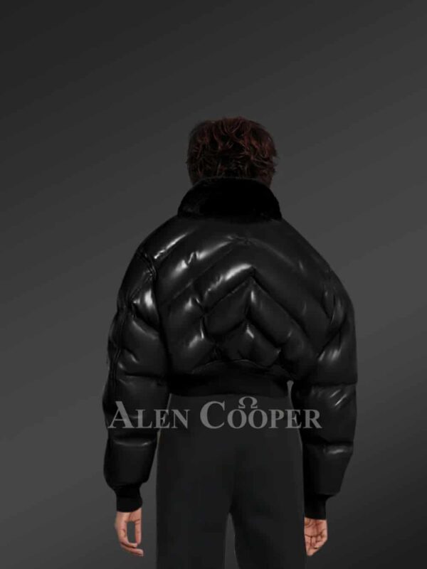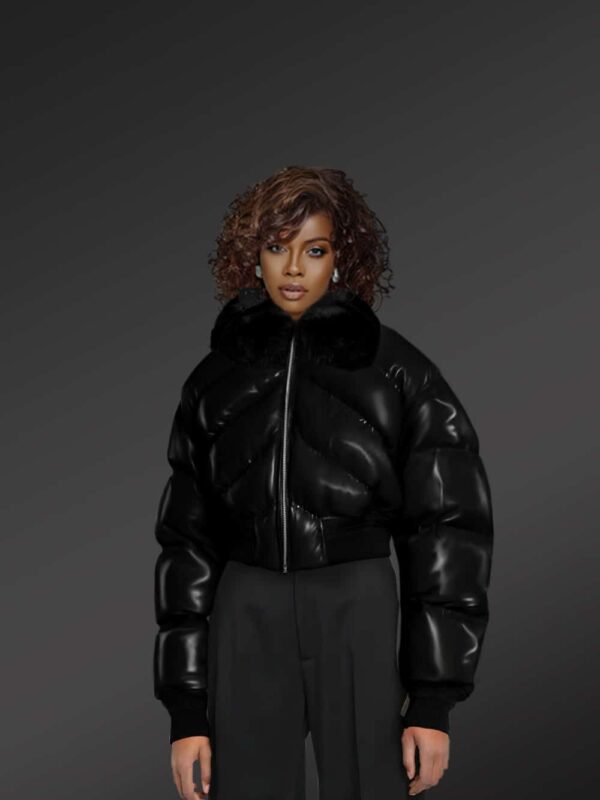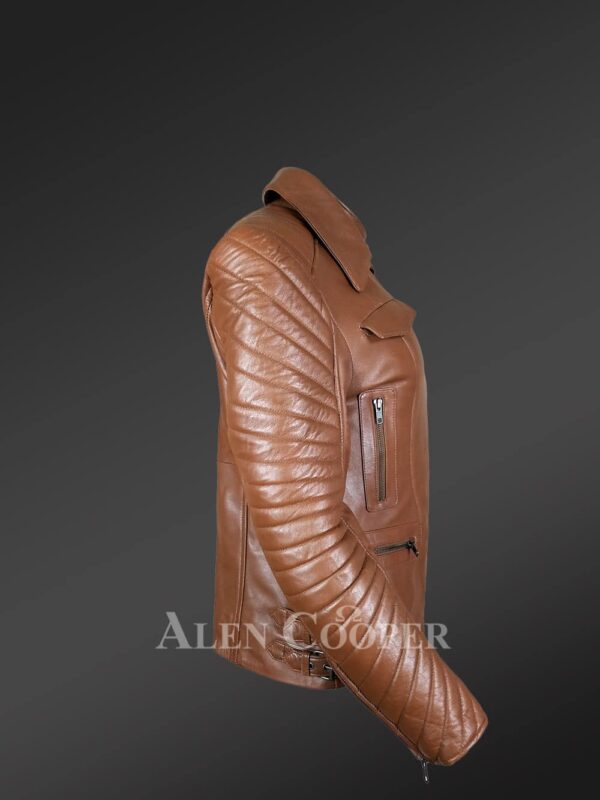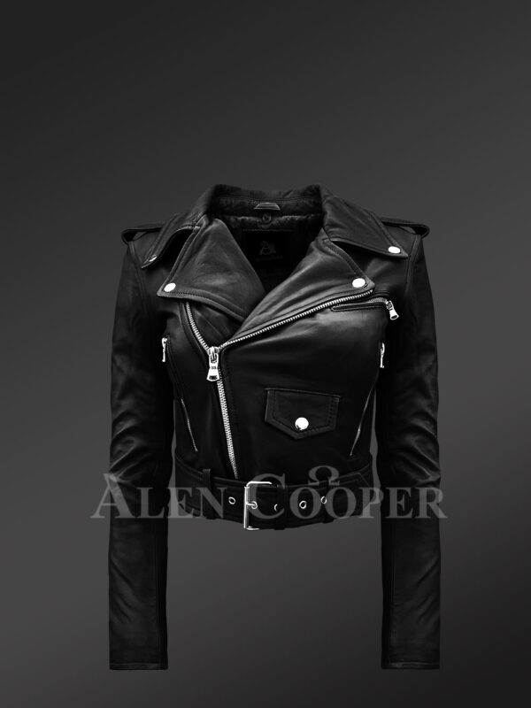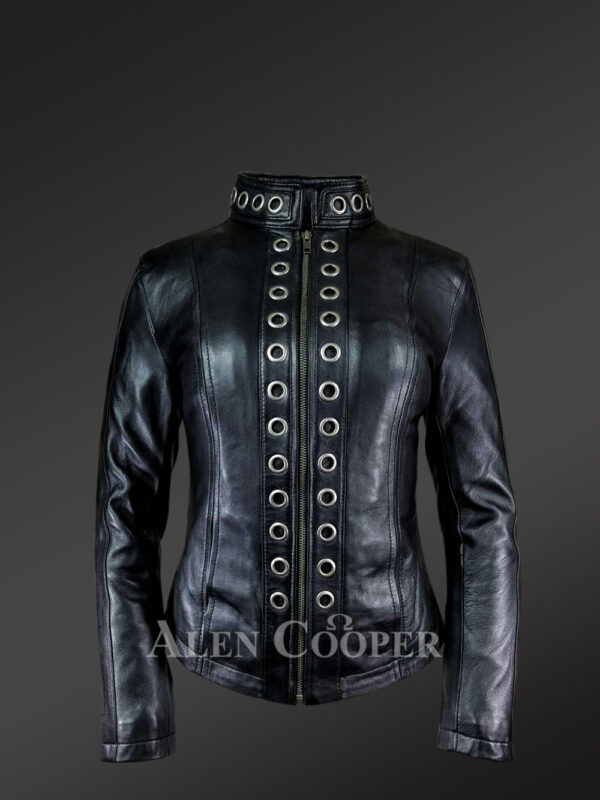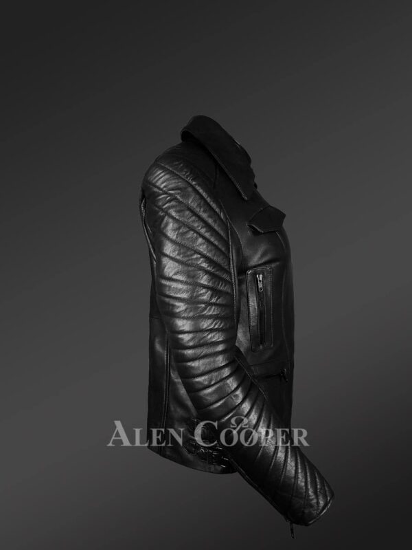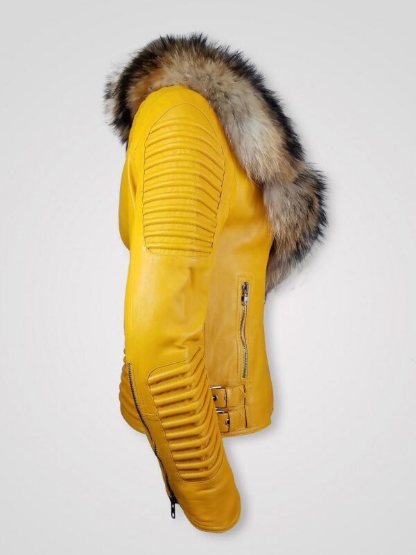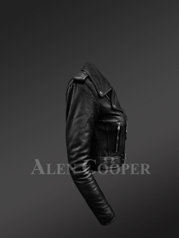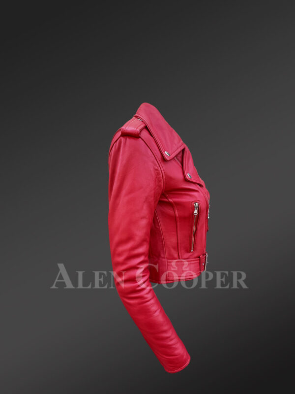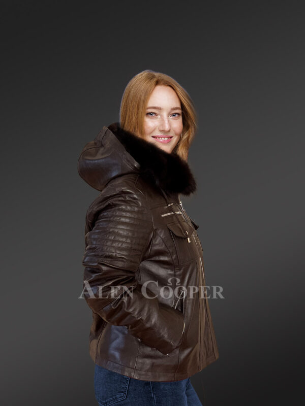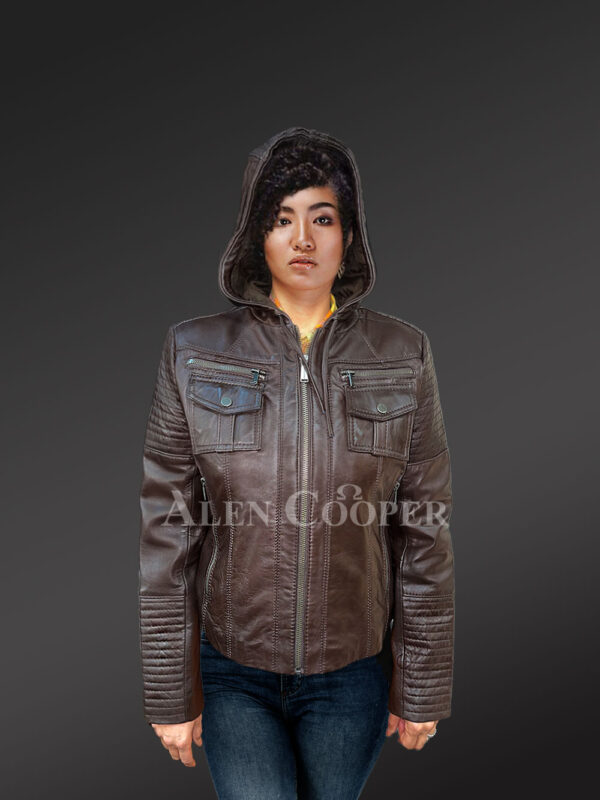 Available in a variety of sizes, this Womens leather motorcycle jacket with wool looks modern and chic. Most important is its protection ability. To point out, it carries stalwart piped feature along prone parts like cuff joints. However, the detailing adds to the beauty. The collar features soft Sheepskin wool trim. The zippered front closing is aligned diagonally. Additionally, zip-line serves as an accessorizing as well as functional trait along cuffs.
