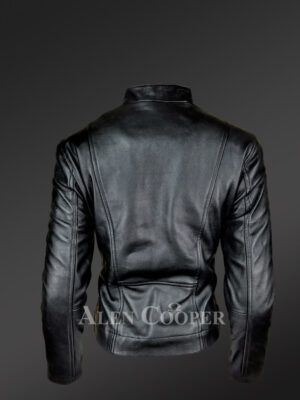 Available in a variety of sizes, this Womens leather motorcycle jacket with wool looks modern and chic. Most important is its protection ability. To point out, it carries stalwart piped feature along prone parts like cuff joints. However, the detailing adds to the beauty. The collar features soft Sheepskin wool trim. The zippered front closing is aligned diagonally. Additionally, zip-line serves as an accessorizing as well as functional trait along cuffs.