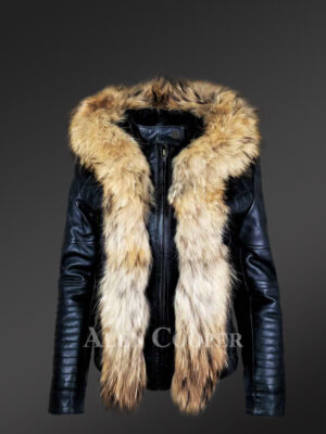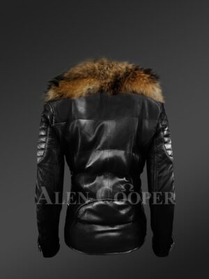 Womens Quilted Leather Biker Jacket with Detachable Raccoon Fur Collar