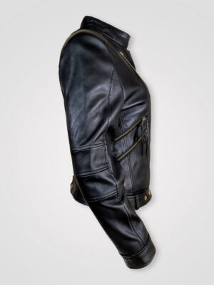 Womens Black Leather Motorcycle Jacket with Unique Zip Fastening Option