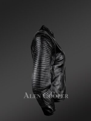 Available in a variety of sizes, this Womens leather motorcycle jacket with wool looks modern and chic. Most important is its protection ability. To point out, it carries stalwart piped feature along prone parts like cuff joints. However, the detailing adds to the beauty. The collar features soft Sheepskin wool trim. The zippered front closing is aligned diagonally. Additionally, zip-line serves as an accessorizing as well as functional trait along cuffs.