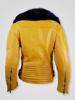 Women’s Motorcycle Biker Jacket with Detachable Fox Fur Collar and Piped Sleeves in Yellow