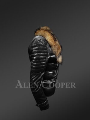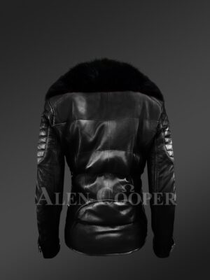 Womens Quilted Black Leather Jacket with Stylish Fox Fur Collar