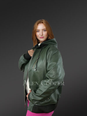 Womens Hooded Leather Bomber Jacket – Crafted with Snug Warmth