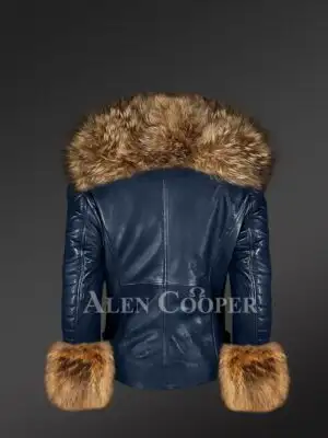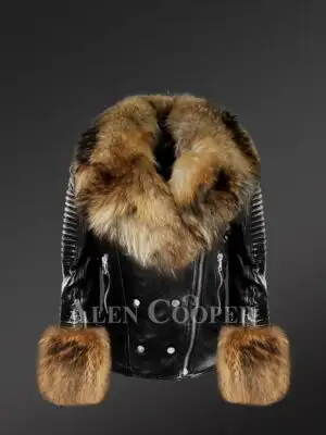Womens Leather Biker Jacket with Detachable Finn Raccoon Fur Collar
