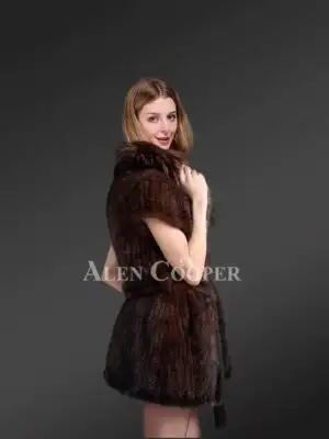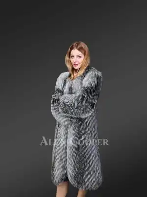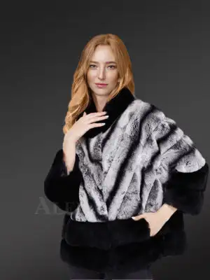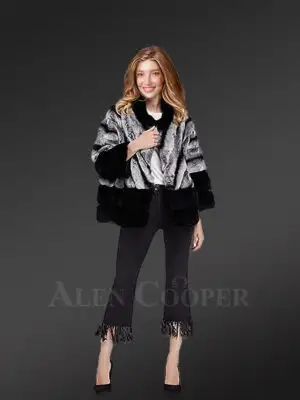 Womens Rabbit Fur High-Neck Coat Looks Chic in Dual Color Chevron Pattern