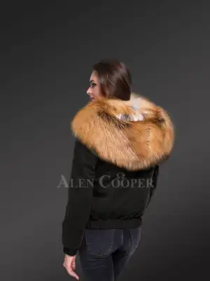 Ladies’ Golden Island Fox Fur Hybrid Black Bomber Jacket with Rabbit Liner Convertibles Reflect Grandeur