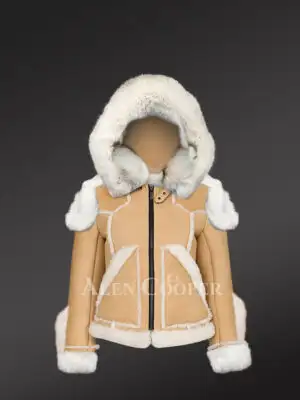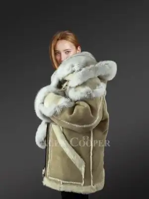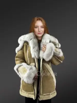 Womens Shearling Jacket with Fox Fur Accent and Detachable Hood