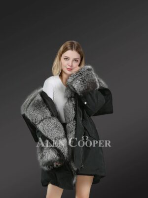 More Aristocratic and Graceful With Ladies’ Scandinavian Silver Fox Fur Hybrid Black Parka Convertibles with Black Rabbit Liner