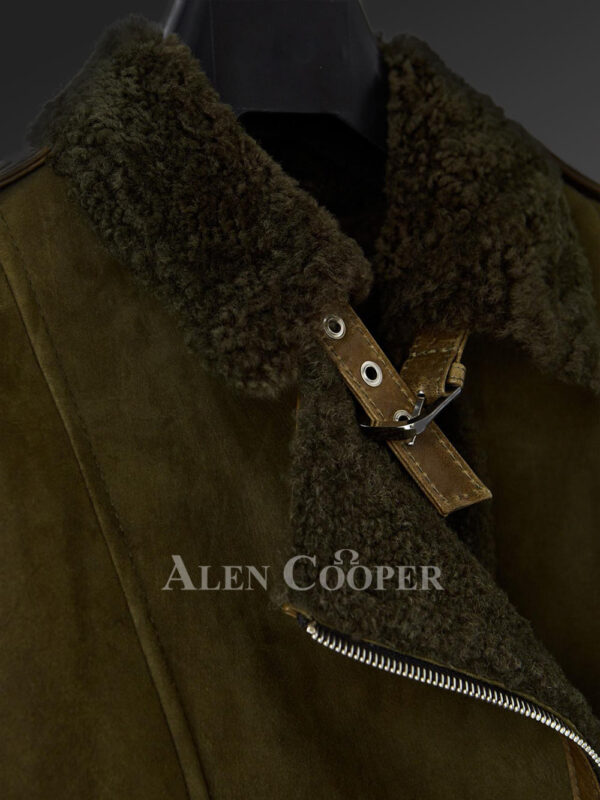 Distressed Olive Green Sheepskin Shearling Jacket for Women