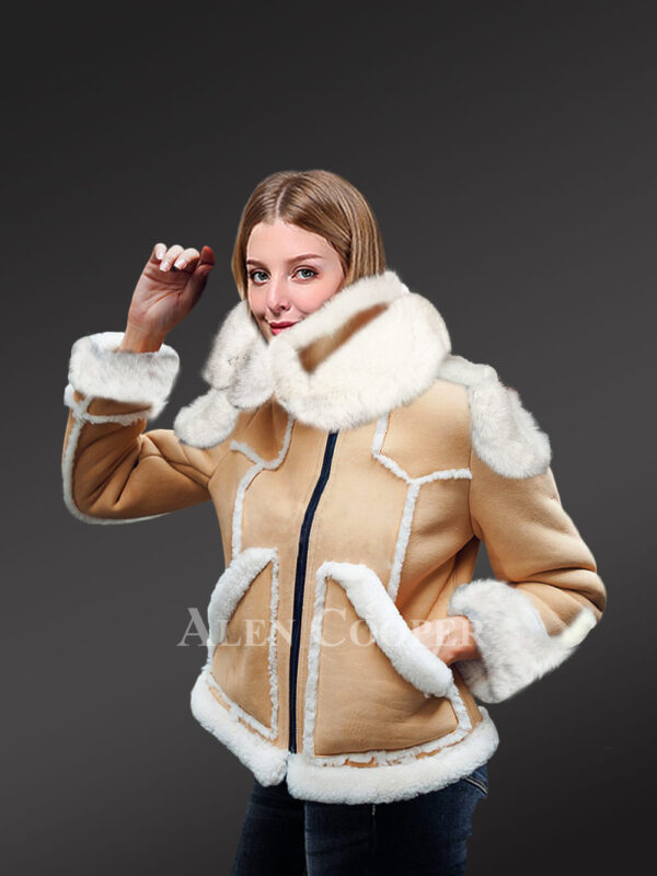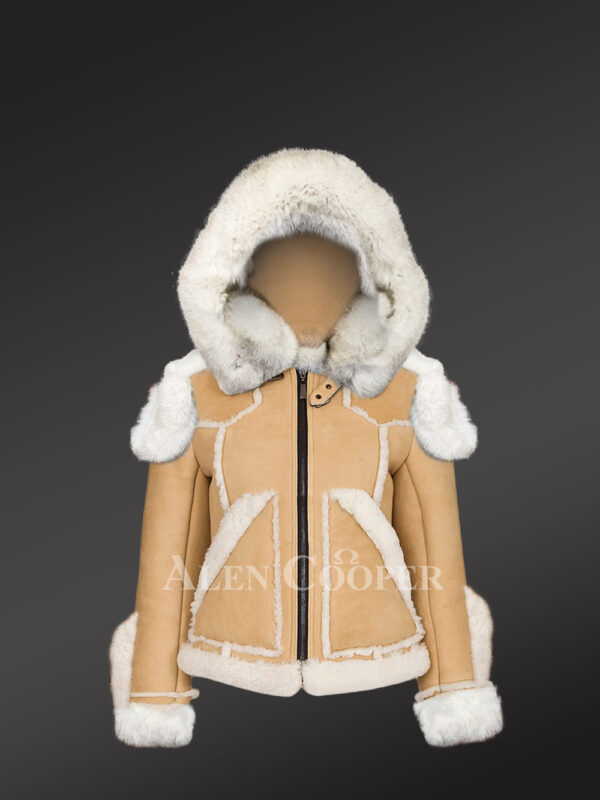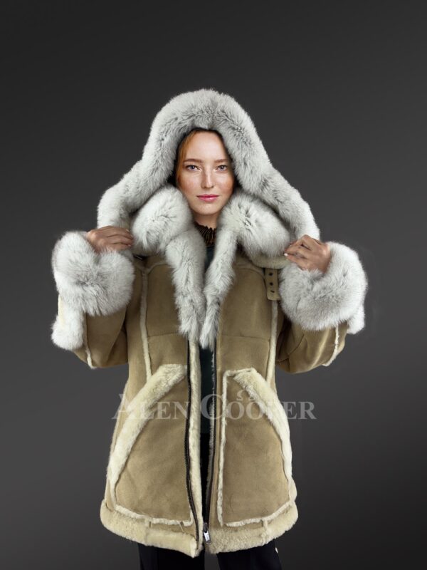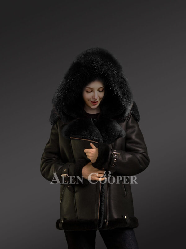 Womens Shearling Jacket with Fox Fur Accent and Detachable Hood