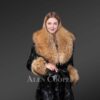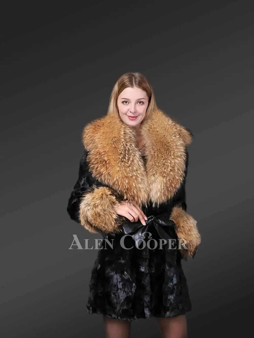 During winter, this stylish mink fur coat with belt will become one’s best companion. The sectioned diamond fur texture adds elegance to it. Additionally, the raccoon fur of almond and golden shade in the collar and cuffs looks striking against the pitch-black body of mink fur. A leather belt at the waistline is certainly another glamorizing feature. This stylish outfit is not just befitting for partying or wintertime festivities. It’s equally ideal for daytime trips or outings.
