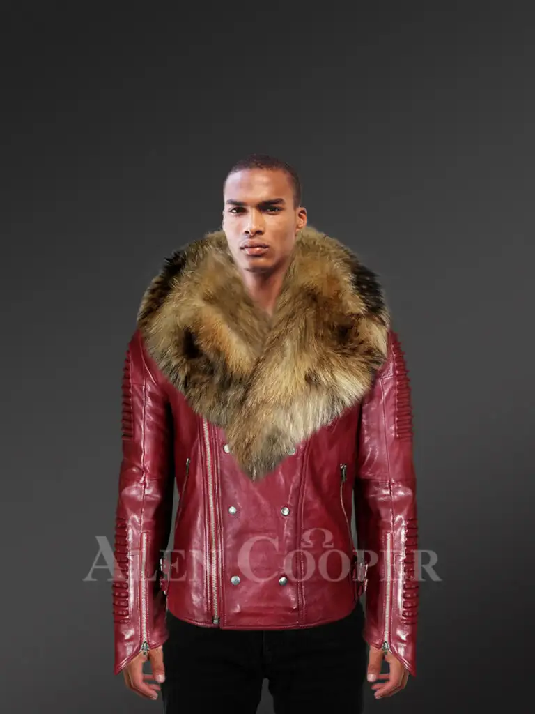 This ritzy biker jacket with raccoon lapel in wine red color will indeed be an excellent choice for grand celebrations or parties. The vibrant color and spectacular design of this trendy outfit can steal the focus of people at any event. The ribbed quilted leather details on the sleeves as well as lower and upper back areas certainly give a modish touch to this jacket. At the same time, it protects the arms, lower and upper back areas of an individual from injuries during any accident. it also has detachable shawl-style lapel of raccoon fur along with a notched lapel of lambskin leather.