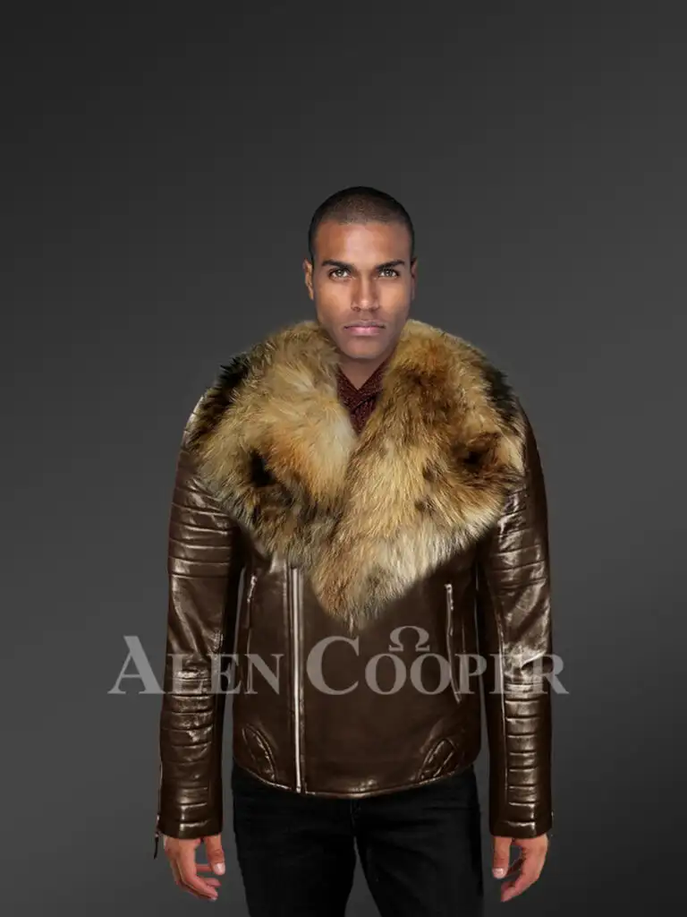 This swanky biker jacket is designed with one detachable collar made of raccoon fur. It features a medley of golden, grey, and black shades and creates an attractive combination with the coffee brown shade. Additionally, this winter-wear has a turned-down collar with a notched lapel for better protection from the cold. Because of the satin lining, it’s markedly comfortable to wear the jacket.