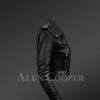 This chic winter-wear features a bold look in pitch black shade. Furthermore, the aniline finish enhances the aesthetic charm of this outerwear. It preserves the natural elegance of the lamb leather. The satin lining is another key point to mention because the jacket feels extremely pleasant to wear.