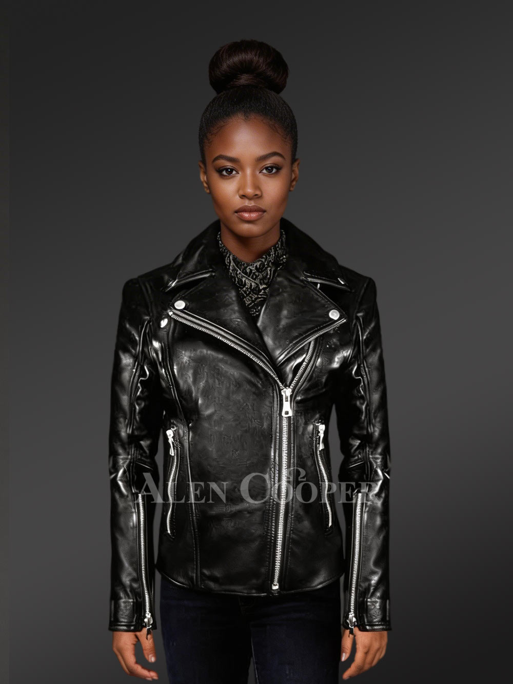 This fashionable womens black leather jacket is undeniably a versatile outfit for the winter. It’s designed using premium lambskin leather which keeps one as comfortable in fall and spring seasons as in the winter. Therefore, one may use this outfit as a modish transitional piece. It certainly forms a gorgeous pairing with different types of women’s attire whether it’s formal, casual or party-wear. Furthermore, its classic black shade matches beautifully with all colors on the palette.