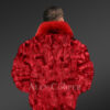 - Waist-length fox fur bomber jacket in a single-tone red shade