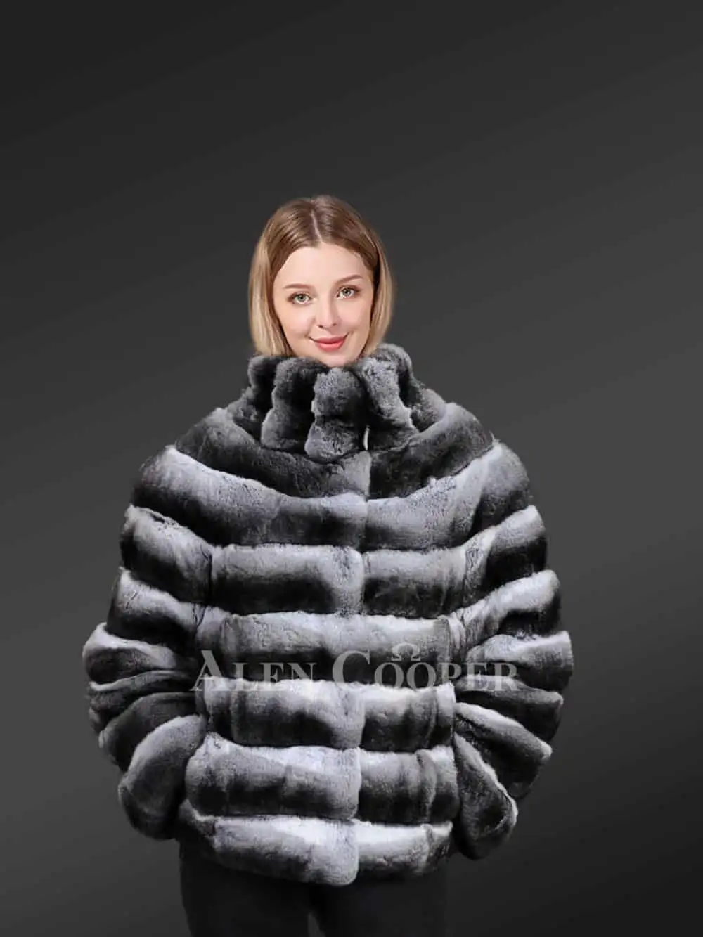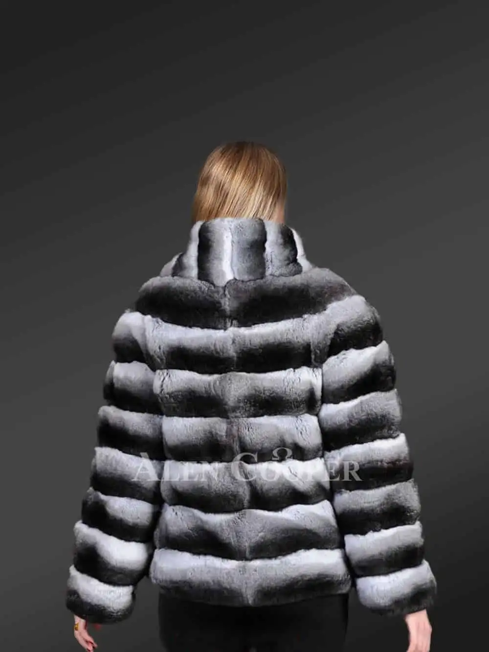 This is a stylish outfit for women with waist-length feature and long sleeves. Genuine Chinchilla fur is incredibly durable and lasts for years with minimal care. This one-of-a-kind coat is a unique and fashionable item. The fur pelts placed horizontally parallel with the natural greyish-white and black hues give the coat an excellent pattern format.