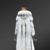 Made up of original quality fox fur pelts, the elegant long fur coat has an eye-catching look. The cross fox fur long coat has a long guard and silky hair. It has got the fusion of grey-white and black shade all over. It shows black lining vertically detailed along the frontline and in box-style around the sleeve section. The texture of the product is luxuriously soft and supple.Â