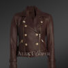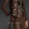 The front pocket’s angled appearance contributes to an updated trend. It has a zipper lock that holds it closed. Notch lapels fall from the collar, enhancing the beautiful double-breast accent. The exquisite silhouette is captured by the dual-column snap button. Jacket’s solo brown tint is complimented with buttons with contrasting golden tones. The high-waist wear is a gorgeous item that meets the requirements for being extremely opulent. It is simple-built, but it has added flourishes and accessories that highlight its elegance beyond the simplicity.
