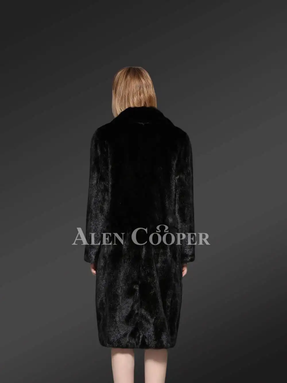 This coat is made of Sheared Mink pelts, which has soft velvety touch with a lustrous look. With Broad Shoulders and a Wide Lapel Collar adds extra value to this over-coat.