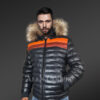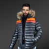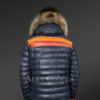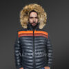 As can be seen, the upper two rows of this jacket are highlighted by orange and red shades in the front as well as in the back. These bright colors look amazing in contrast to the pitch black shade. This fascinating contrast in colors certainly heightens the aesthetic appeal of this winter-outfit. The leather hood is another impressive feature of this jacket. It’s bordered by the finest quality raccoon fur. This isn’t just an aesthetically pleasing feature. It also shields one’s face from the cold air.