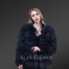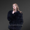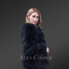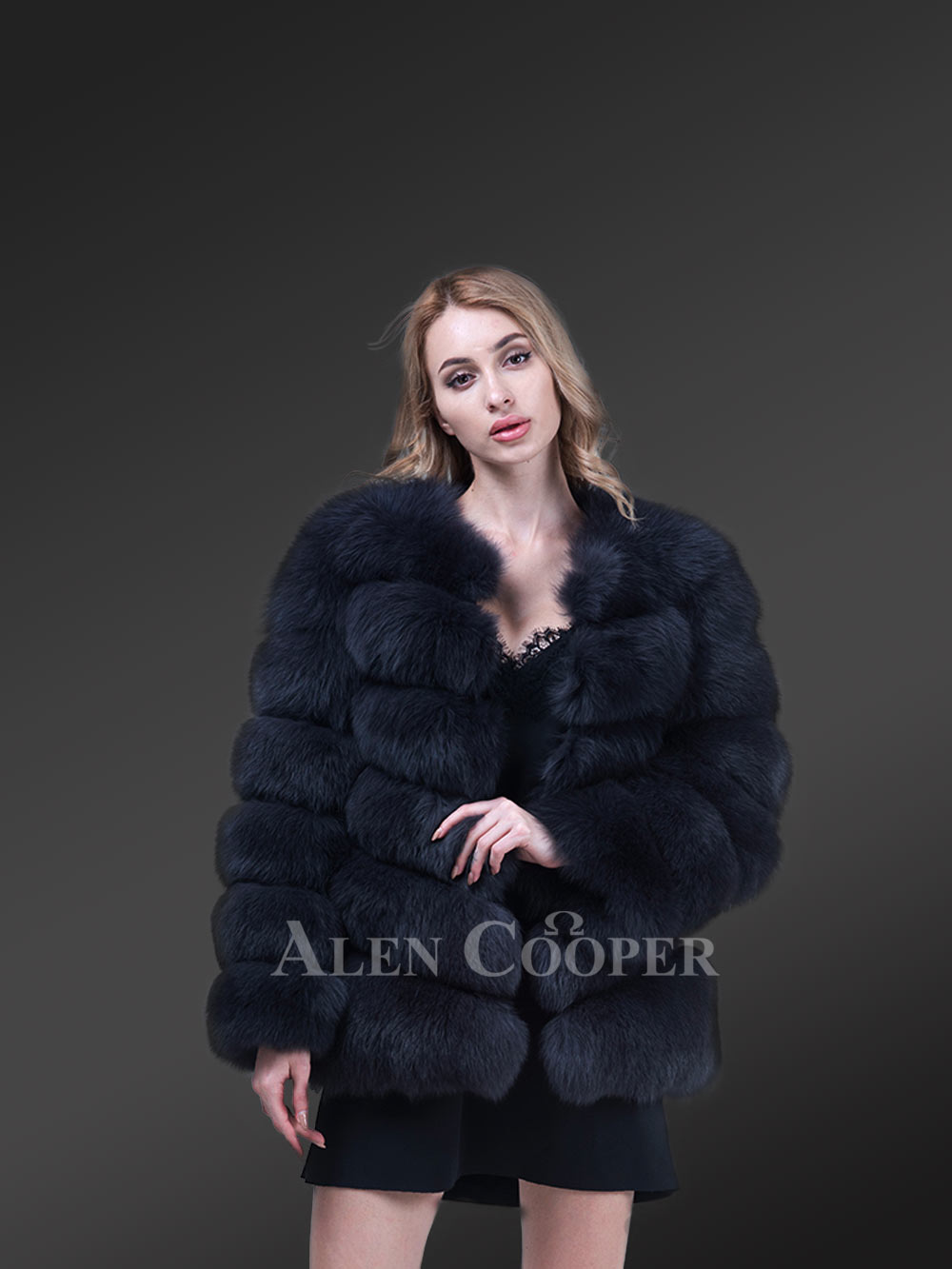 The round jewel neckline naturally augments the imperial look of this winter wear. It flaunts a gorgeous coal-black shade in a tee-length form running a little below the waistline. The slant-style pockets featuring on either side keep the hands warm from biting cold air as well as carry small valuables. The central zip-up furnishes a classy appearance, concurrently comforting women with absolute thermal closure. The puffy style of Arctic fox fur allows the wearer to flexibly style up in its sleek demeanor with regal comfort. This winter statement piece maintains the perfect fashion equilibrium between plush elegance and utilitarian features.