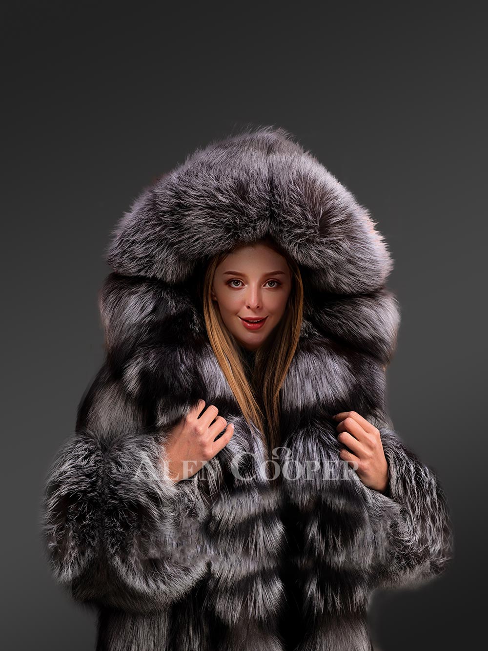 Made from finest quality fur of silver fox, this gorgeous Fox Fur Long Coat Women can make any woman look like a diva at a gala or event this winter. Because of dense down, it boasts of voluminous looks. Furthermore, this long coat can be closed using a clip lock hook. The furry front-line enhances the aesthetic appeal of this winter-wear in a combination of grey and black shades.