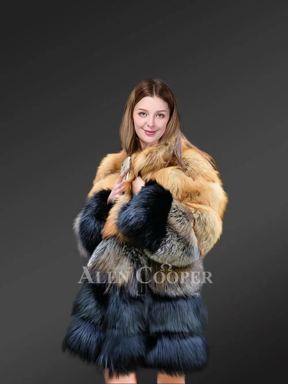 This exquisite fox fur multicolored coat can be the ultimate outfit for parties or fests in winter because of its gorgeous looks. The upper tiers are designed using the pelts from Red fox while the fur from Silver fox forms the lower tiers. Without a doubt, this outfit looks magnificent in reddish yellow and bluish grey shades. Furthermore, the paragraph pattern arrangement of the fur magnifies its elegance.